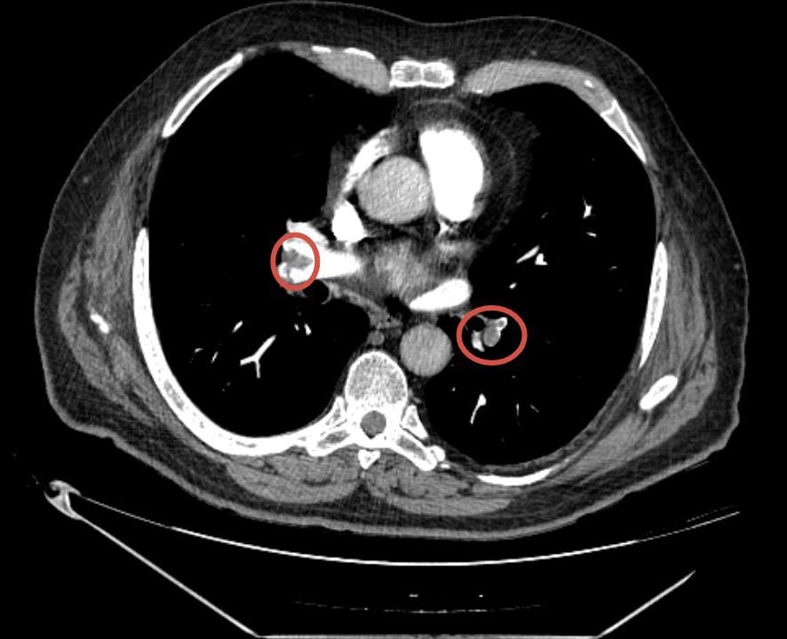 За последний год пациент дважды переносил тромбоэмболию лёгочной артерии, включая эпизод, потребовавший системного тромболизиса в апреле 2025 года.