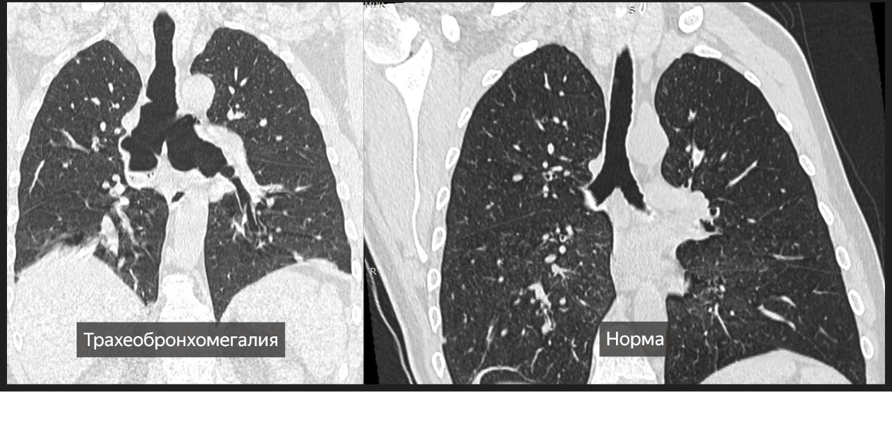 На КТ грудной клетки выявлены: ателектаз, скопление секрета в бронхах и трахеобронхомегалия — ключевой признак синдрома Мунье–Куна. Такое расширение трахеи и крупных бронхов делает пациента уязвимым к частым инфекциям дыхательных путей.