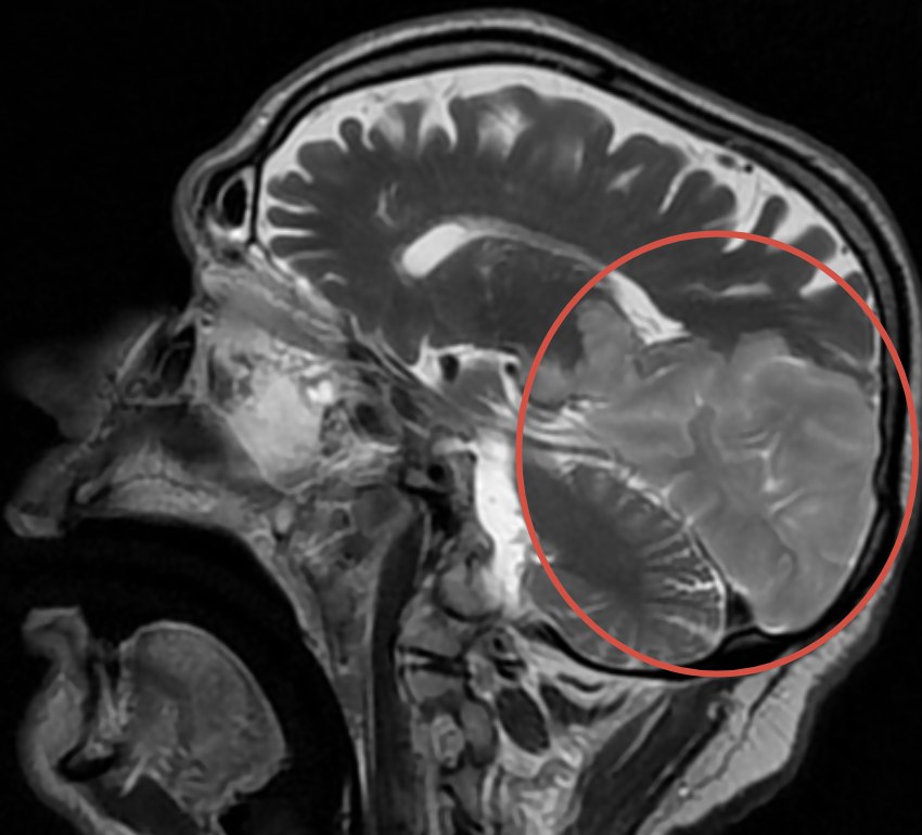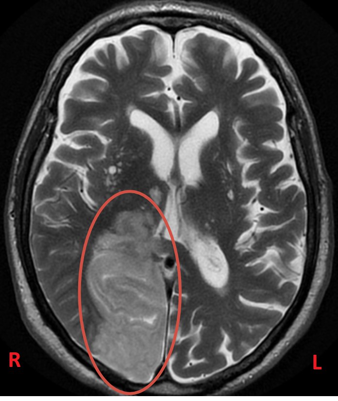 В нашем случае МРТ показала инсульт в правой затылочной доле (в бассейне правой задней мозговой артерии).