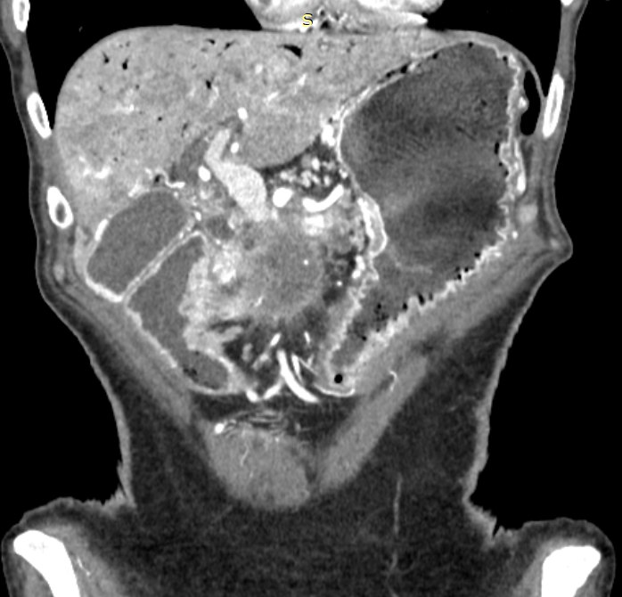 Очевидная дуоденальная кишечная непроходимость, обусловленная опухолевым ростом поджелудочной железы.