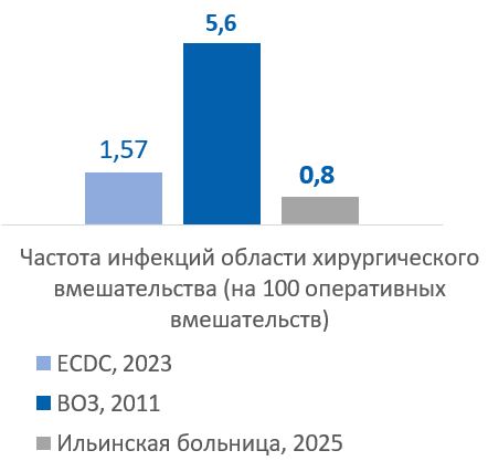 Сопоставление наших данных с обобщенными международными показателями, публикуемыми авторитетными профессиональными организациями, показывает, что уровень инфекционной безопасности в Ильинской больнице остается стабильно хорошим. Это свидетельствует об эффективности действующей системы профилактики и контроля.