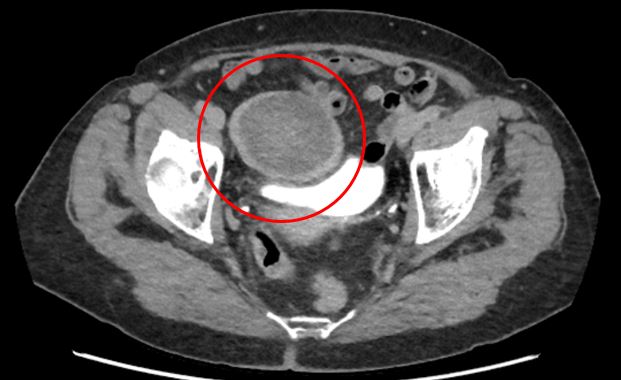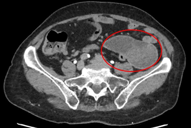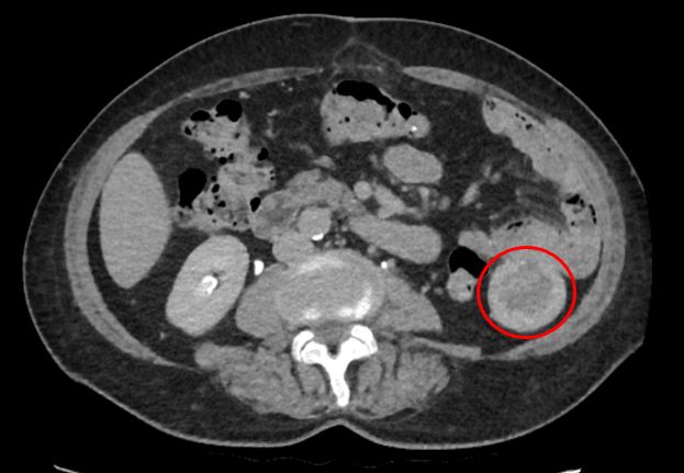 По результатам КТ живота с контрастированием выявлены неорганные образования в брюшной полости, расположенные между петлями кишечника с выраженной фиброзной капсулой, а также состояние после спленэктомии и консолидированные переломы ребер слева. Учитывая анамнез, одним из самых вероятных подозрений стало возможное наличие «инкапсулированных инородных тел».