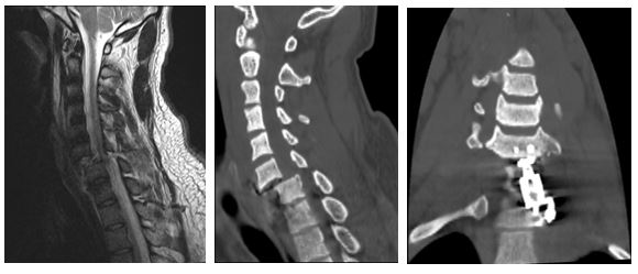По месту жительства операция была выполнена в ранние сроки после травмы — это принципиально важно при повреждении спинного мозга. Однако полного вправления вывиха позвонков достигнуто не было. В дальнейшем произошло повторное смещение костных структур с сохраняющейся компрессией спинного мозга. Через три месяца после травмы пациент поступил к нам с выраженной болезненной деформацией шейного отдела позвоночника и тяжёлыми неврологическими нарушениями в верхних и нижних конечностях.