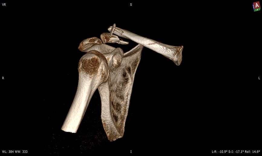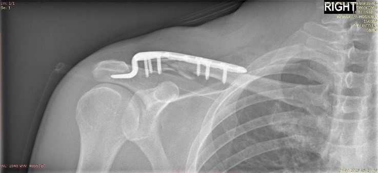 Операция выполнена на следующий день. Выбрана самая стабильная фиксация: крючкообразная пластина для акромиального конца ключицы позволяет восстановить длину и форму самой ключицы, а также убрать нагрузку со связок акромиально-ключичного сочленения, способствовать их сращению заведением крюка под акромиальный отросток лопатки, то есть перенеся в эту точку напряжение с винтов пластины.